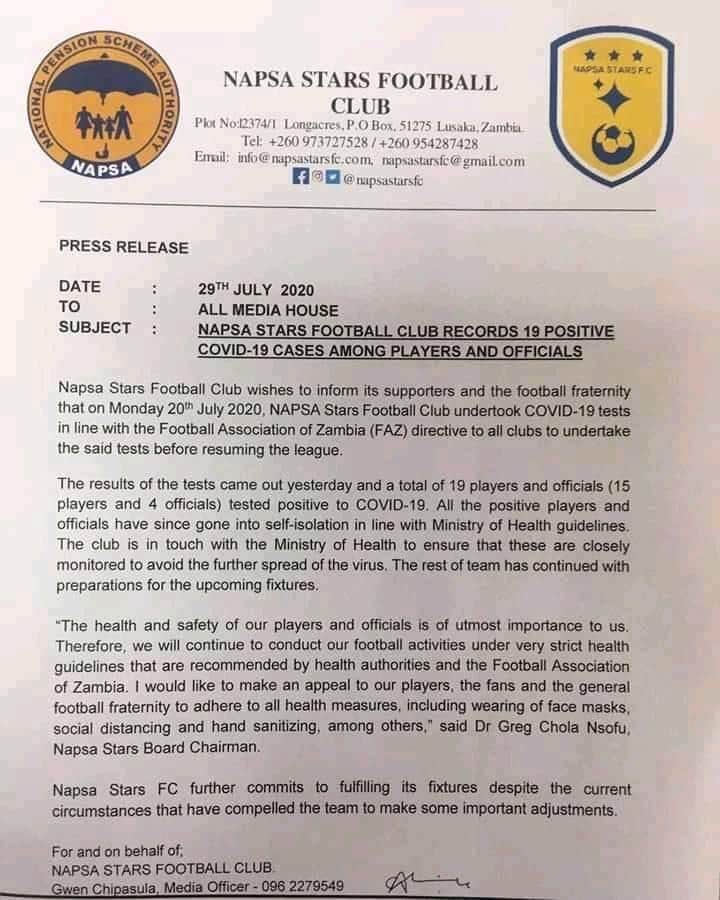 “Napsa Stars Football Club wishes to inform it’s supporters and the football fraternity that on Monday 20th July 2020, Napsa Stars Football Club undertook COVID-19 tests in line with the Football Association of Zambia (FAZ) directive to all clubs to undertake the said tests before resuming league,” he said.