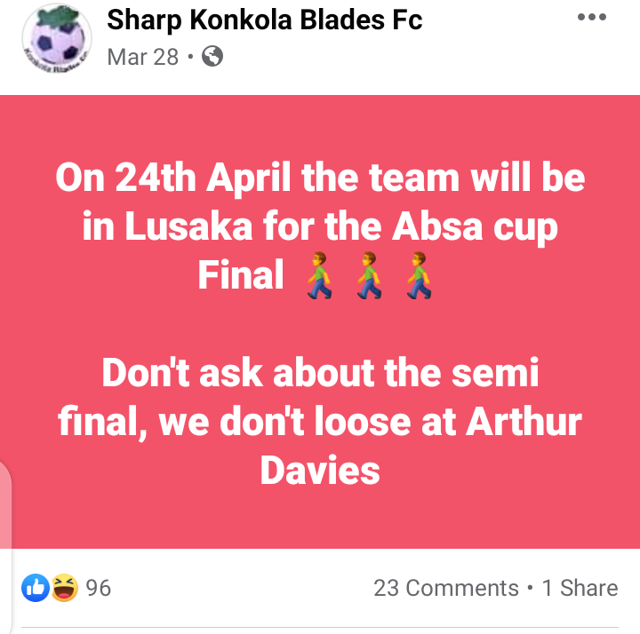 Blades will face a very dangerous Zesco United in the Semifinals but impossible is nothing in football.