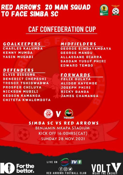 Defenders: Elvis Bissong, Benedick Chepeshi, Tresor Tshibwabwa, Prosper Chiluya, Nickson Mubili, Kebson Kamanga, Chiteta Kwalombota