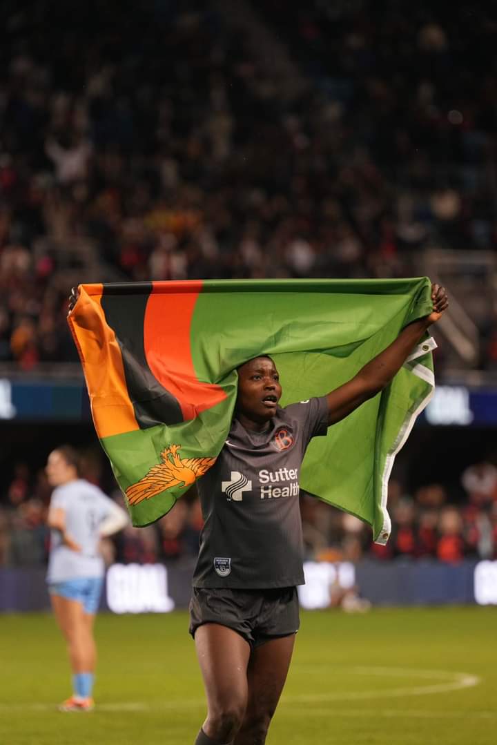 The former Madrid CFF forward raced to the dugout to pick the Zambian flag which she wrapped around her body to display in front of 18,000 supporters that witnessed Bay FC’s first home match of the season.