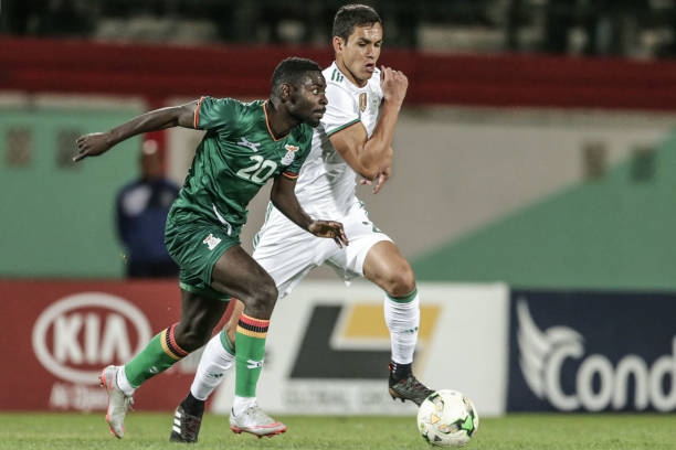 14 November 2019, Algeria, Blida: Zambia’s Evans Kangwa (L) and Algeria’s Aissa Mandi battle for the ball during the 2021 Africa Cup of Nations qualifying Group H soccer match between Algeria and Zambia at the Mustapha Tchaker Stadium. Photo: Farouk Batiche/dpa (Photo by Farouk Batiche/picture alliance via Getty Images)