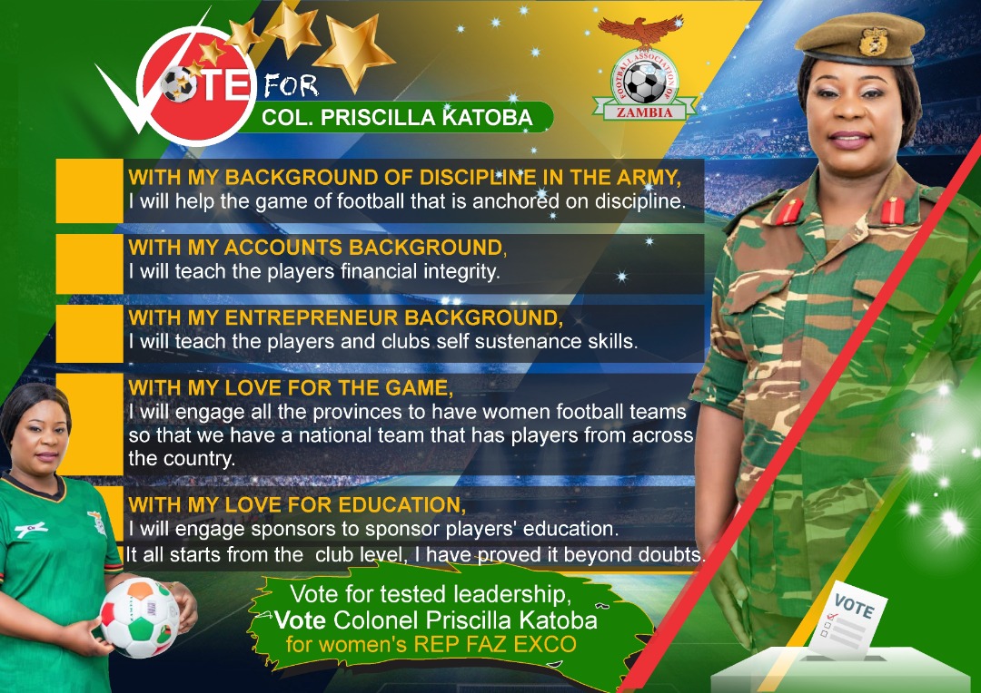 Col Katoba is currently the Deputy Director-General Finance Branch and draws her motivation from her late father Mr. Fredrick Katoba who was the President and sponsor of Sala United football club in Nampundwe area Mumbwa District and FIFA Secretary General Fatma Samoura.