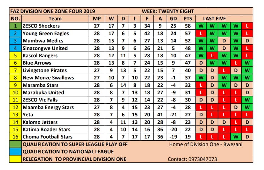 In Zone three it’s a straight forward matter with KYSA having wrapped up their place in the playoffs but National Division One is not clear as some of the teams may be disqualified by Club Licensing. Real Nakonde could qualify to National Division One in this zone among those fighting for National Division One slot.