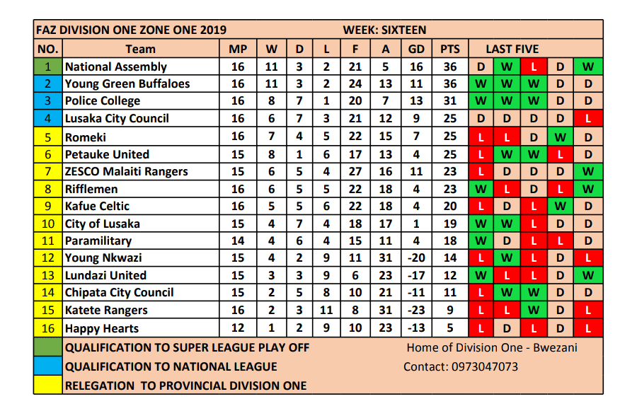 Young Green Buffaloes caught up with National Assembly on 36 points and are only behind on goal difference . Assembly drew at home to Lusaka City Council whole Young Green Buffaloes were too good in Chipata against Chipata City Council.