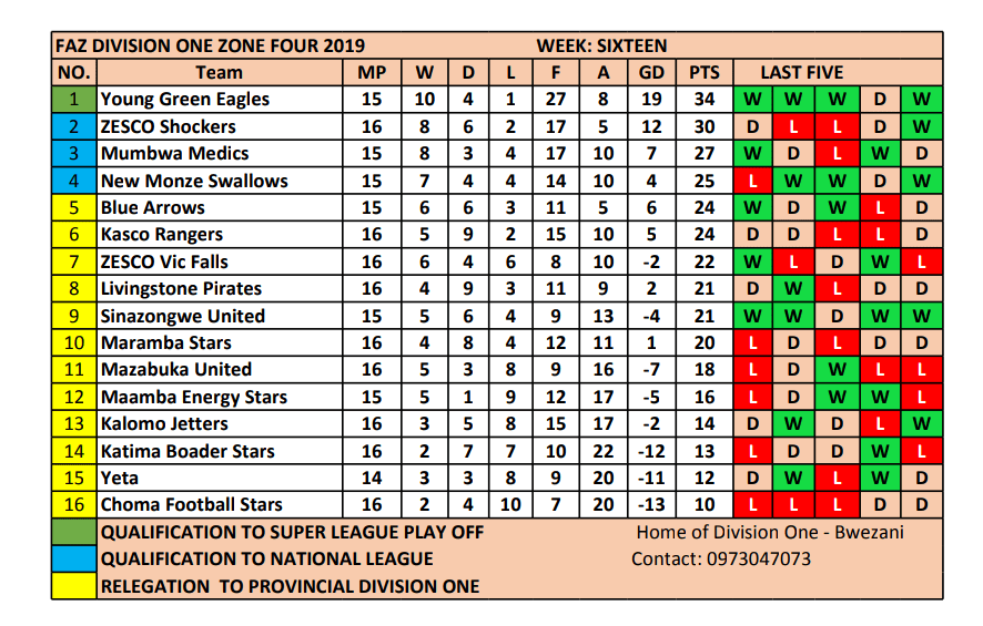 Young Green Eagles take over leadership in Zone Four after an impressive run of results which has seen Zesco Shockers go second with a string of draws and losses.