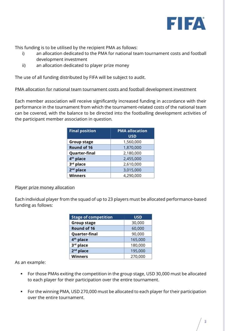 “Each member association will receive significantly increased finding in accordance with their performance in the tournament from which the tournament related costs of the national team can be covered, with the balance to be directed into the footballing activities,” read a FIFA statement