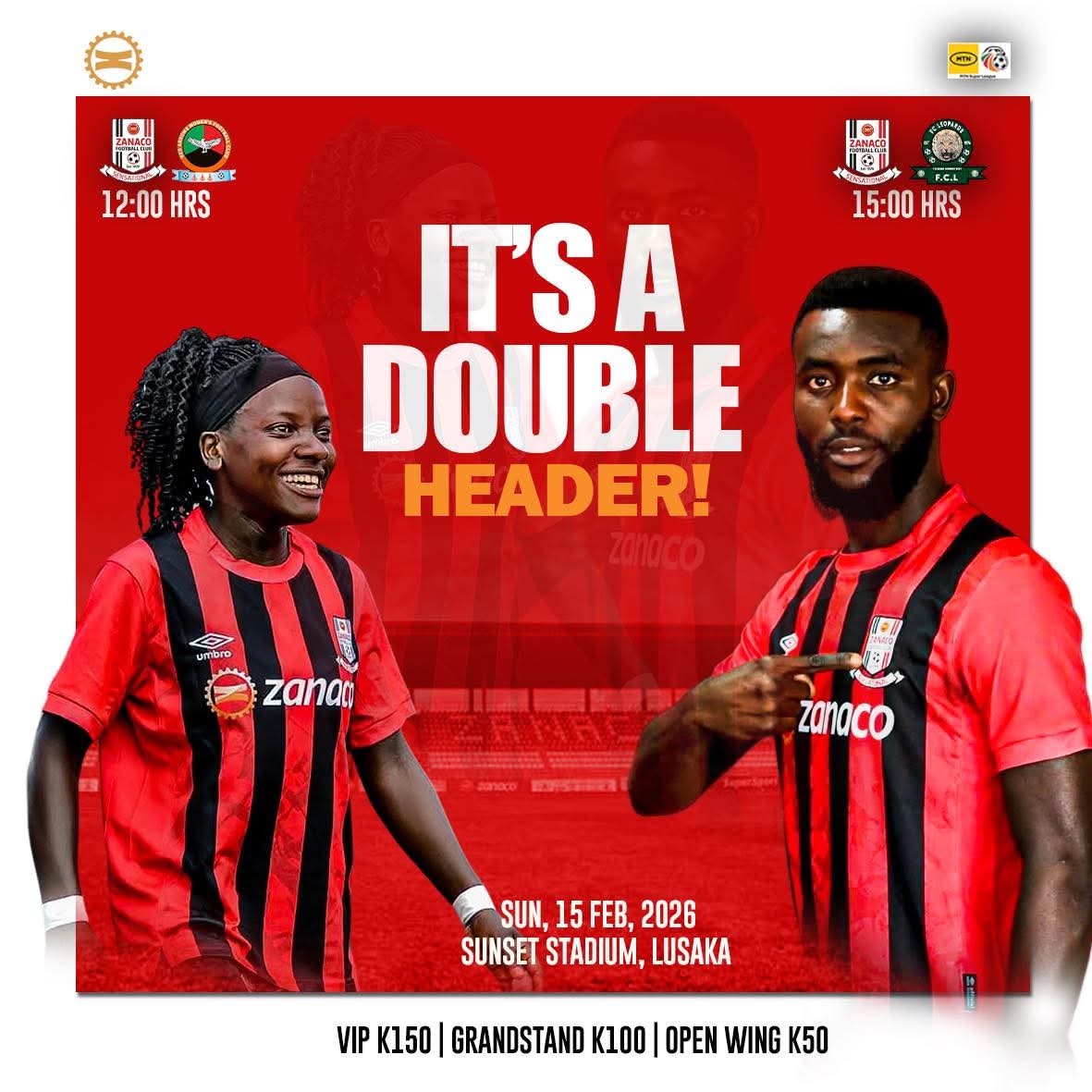 Sunset Stadium is bracing for a football feast as Zanaco host a thrilling double-header on Sunday, February 15, with women’s and men’s league action promising nonstop excitement from midday to dusk.