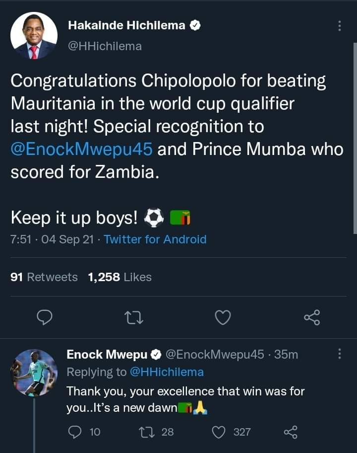 “Congratulations Chipolopolo for beating Mauritania in the World Cup qualifiers last night! Special recognition to Enock Mwepu and Prince Mumba who scored for Zambia.