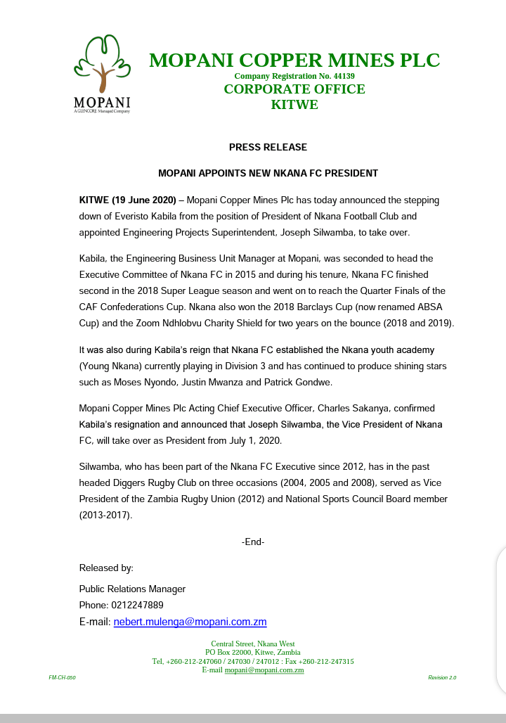 Mopani Copper Mines Plc has today announced the stepping down of Evaristo Kabila from the position of President of Nkana Football Club and appointed Engineering Projects Superintendent, Joseph Silwamba, to take over.
