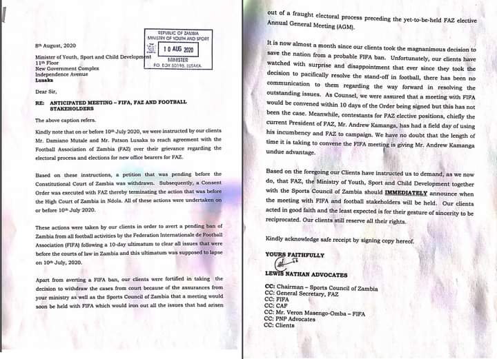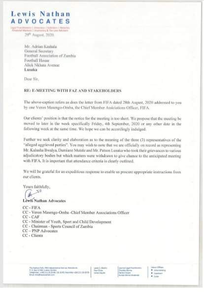 “Our clients’ position is that the notice for the meeting is too short. We propose that the meeting be moved to later in the week specifically Friday, 4th September 2020, or any Other date in the following week at the same time. We hope we can be accordingly indulged,” the letter states. “Further we seek clarity and elaboration as 10 the meaning of the three (3) representatives of the “alleged aggrieved parties”. You may wish to note that we are officially on record as representing Mr. Kalusha Bwalya, Damiano Mutale, and Mr. Patson Lusaka who took their grievances to various adjudicatory bodies but which matters were withdrawn to give chance to the anticipated meeting with FIFA. It is important that attendance criteria are clearly outlined.”