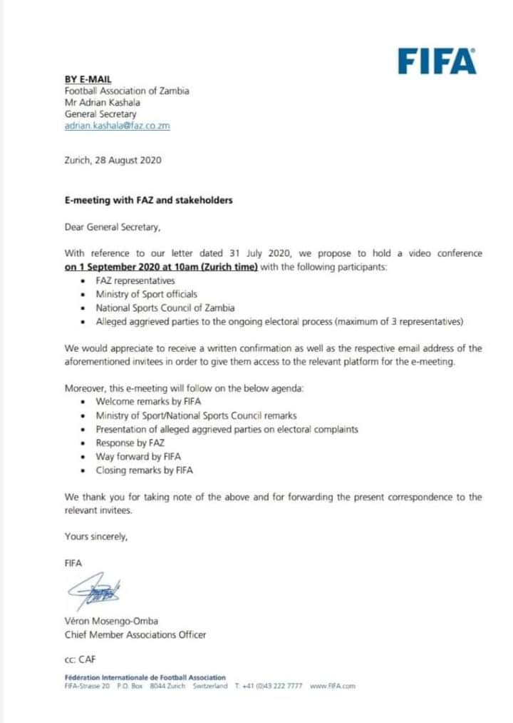 Three days ago, FIFA announced through a letter to FAZ that it was set to meet the Football Association of Zambia (FAZ) and the aggrieved parties (over issues surrounding the 2020 FAZ elections) via a video conference call tomorrow Tuesday 1st September 2020. The letter dated 28th August and signed by FIFA Chief Member Associations officer Véron Mosengo-Omba detailed that the meeting would have representatives of the alleged aggrieved parties, the Ministry of Sport, National Sports Council of Zambia, and FAZ.