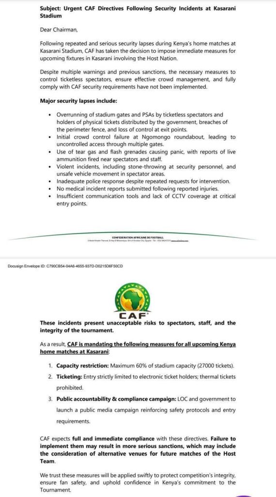 Following repeated and serious security lapses during Kenya’s home matches at Kasarani Stadium, CAF has taken the decision to impose immediate measures for upcoming fixtures in Kasarani involving the Host Nation.
