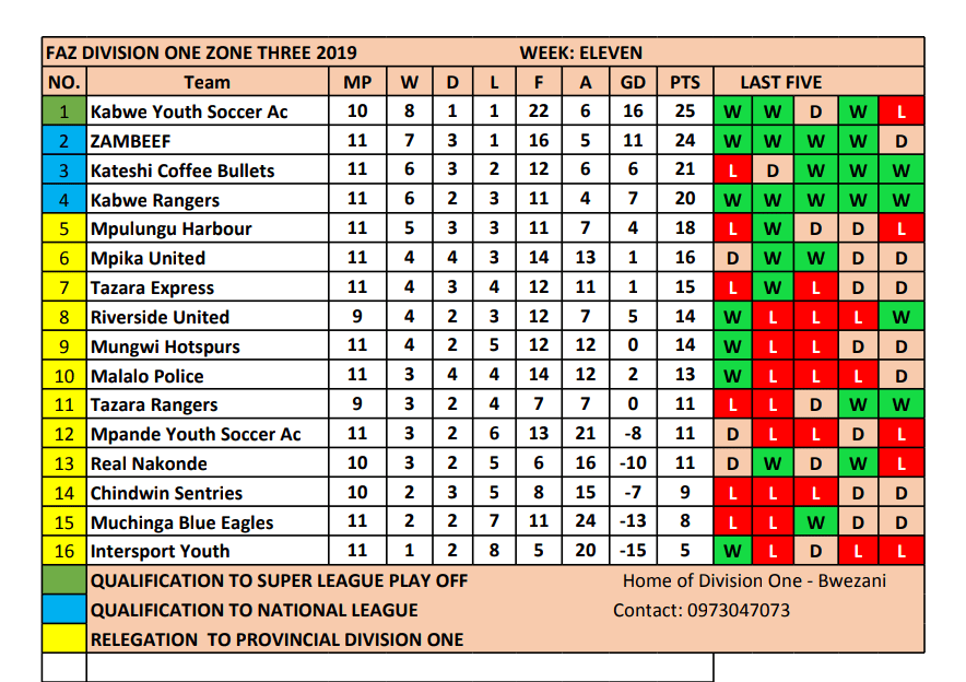 Week eleven ended with National Assembly and Young Green Buffaloes on 25 points after both teams managed wins against Happy Hearts and ZESCO Malaiti Rangers respectively. Chipata City Council remain winless after another loss this time to their province counterpart in Lundazi United. They remain at the bottom on three points from the three draws they have collected in 11 games.
