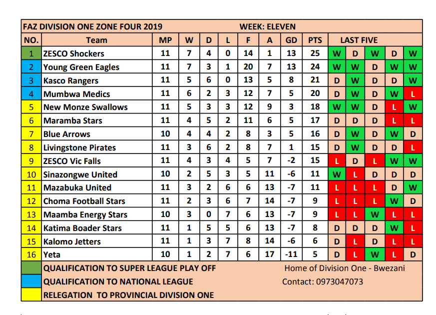 ZESCO Shockers is having the time in this zone and lead zone four now for weeks with fellow Academy in Young Green Eagles following closely below with a point. Kascol Rangers and Mumbwa Medics are a surprise in the top four and continue grinding results at will. It will be difficult to displace them.
