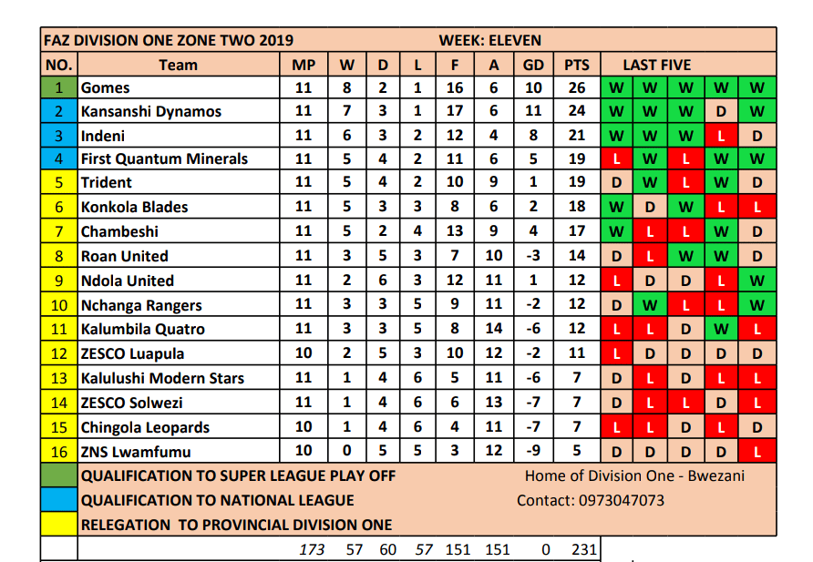 Gomes managed to get back to the top of Zone Two after a 2-1 victory against a very determined FQMO on Monday Afternoon. Kansanshi dropped to second after being in charge for less than 48 hours. Gomes also record a record five straight wins this season in the zone and will be hoping consistence will be their mark to win a Super League Play off at the end of this season. Kansanshi Dynamos, Indeni, FQMO and Chambishi in the coming games.
