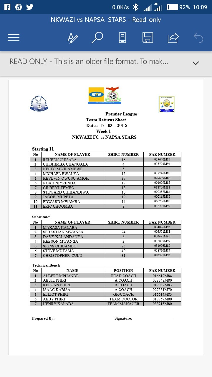 KABWE WARRIORS STARTING LINE UP AGAINST NAKAMBALA LEOPARDS*