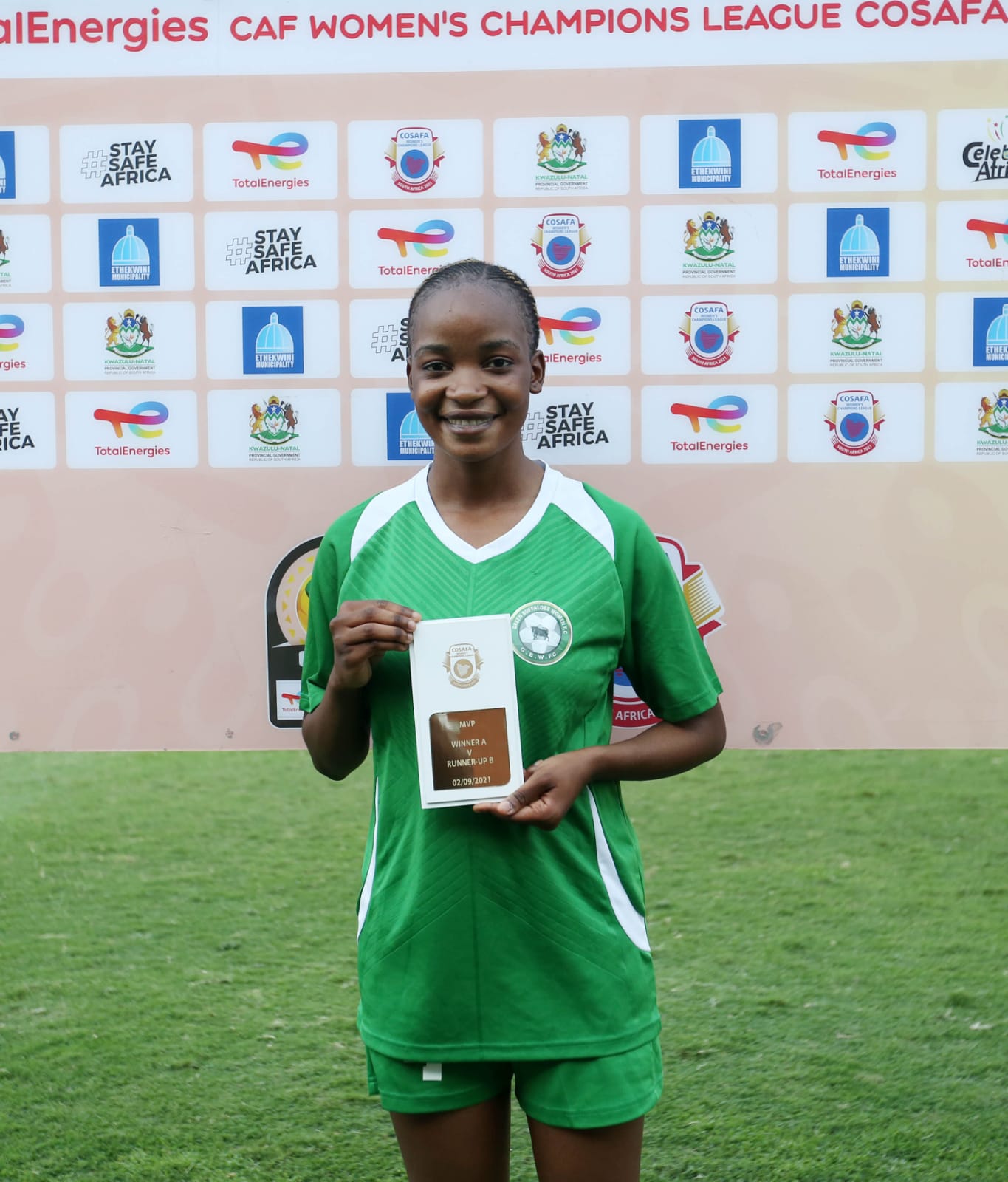 Green Buffaloes Women Football Club Defender Lushomo Mweemba is elated after she was voted as player of the match yesterday in the 2021 TotalEnergies CAF Women’s Champions League l COSAFA Qualifiers 1-0 semi-final loss to South Africa’s Mamelodi Sundowns at King Zelwathini Stadium in Durban with the only goal scored by Melinda Kgadiete just before half time.
