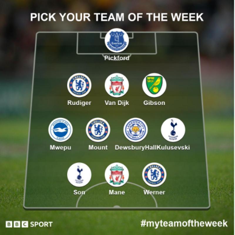 BBC Sport team of the Week : Jordan Pickford, Antonio Rudiger, Virgil Van Dijk, Ben Gibson, Enock Mwepu, Mason Mount, Kierian Dewsbury Hall, Dejan Kulusevski, Timo Werner, Sadio Mané, Son Heung-min.