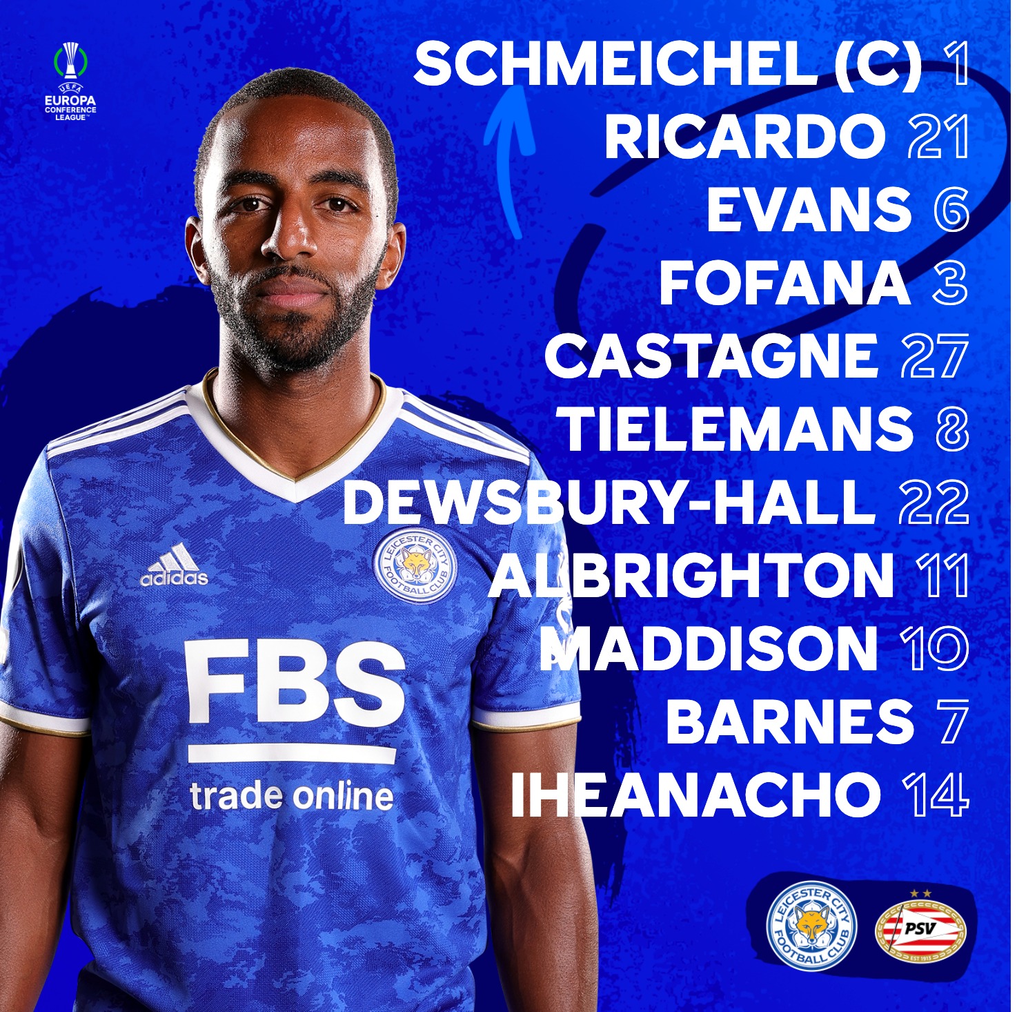 Kasper Schmeichel starts in goal with Wesley Fofana, John Evans, Timothy Castagne and Ricardo Pereira making up the back four.