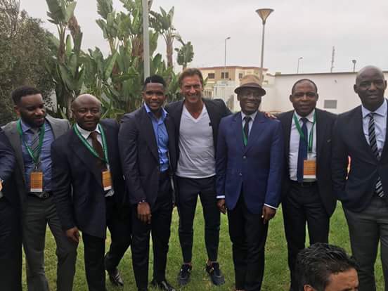 Former Football Association of Zambia president Kalusha Bwalya second from right with With Jay Jay Okocha, Abedi Pele, Samuel Eto, Herve Renard, Josepha Antoine Bell, and Anthony Baffoe