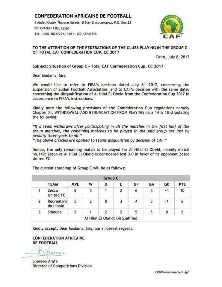 CAF has awarded Zesco United a 3-0 win over Sudanese side Al Hilal Obayed