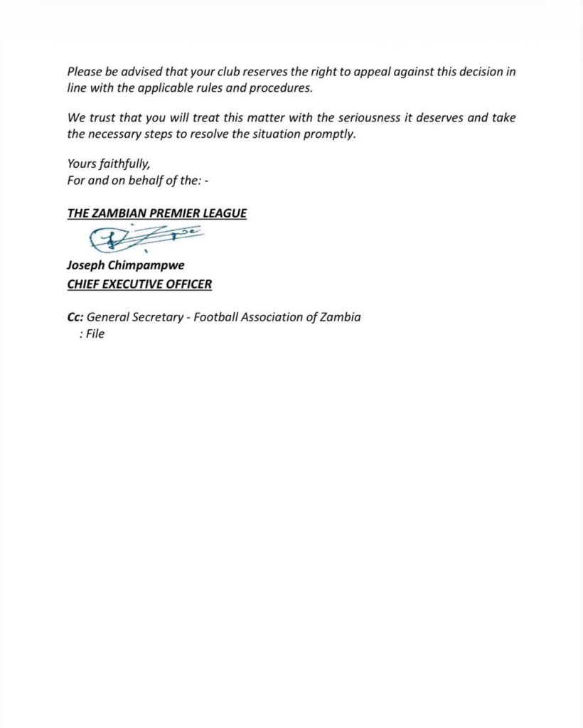 In a letter addressed to ZESCO United, the Zambian Premier League outlined the circumstances that led to the decision, confirming that the move was triggered by the club’s decision to pursue the matter through the courts.